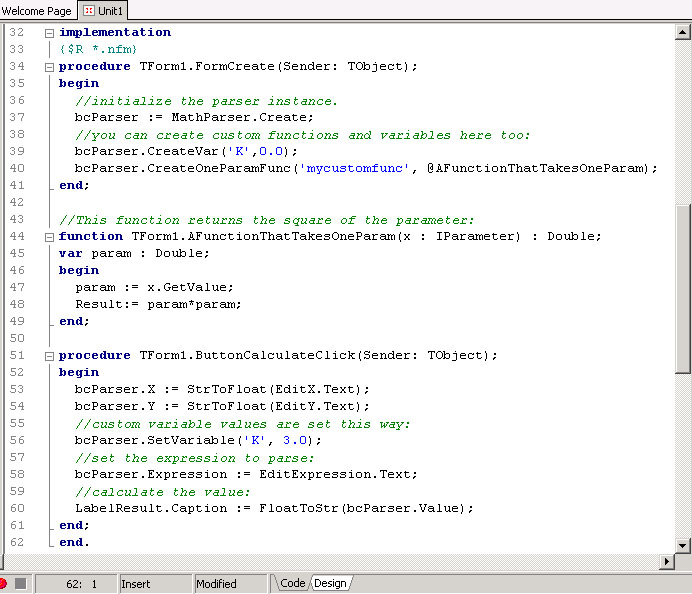 Once you have a reference to the assembly, you can use the Bestcode.MathParser unit (namespace) in your uses clauses. Below is Delphi 8 Example source code for the math parser .NET version: